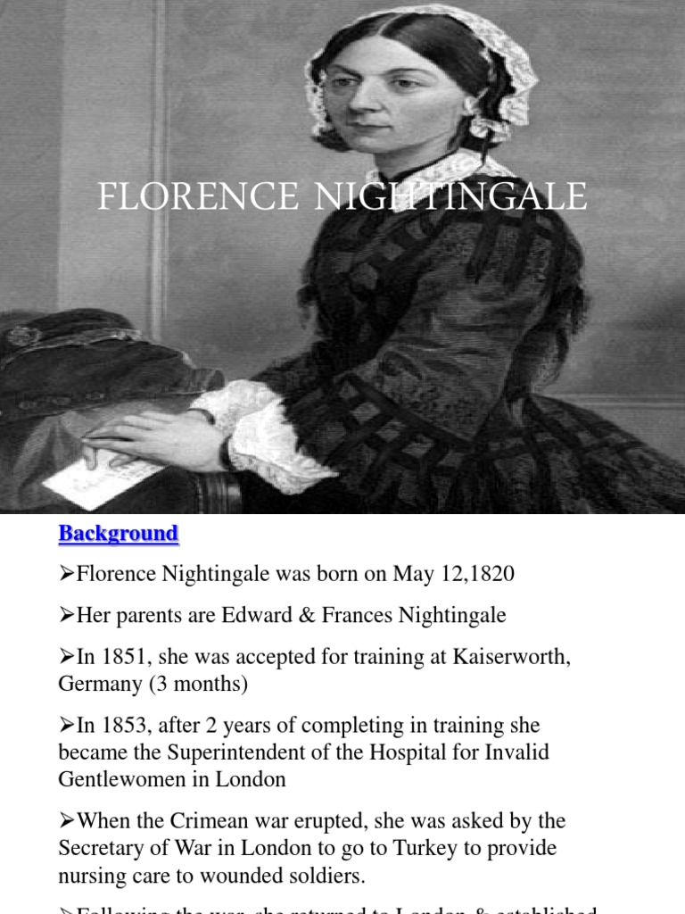 English as a second language (esl) grade/level: Florence nightingale was born into a wealthy family but decided she wanted to be a nurse. Use the next clean page write the date and title to answer in complete sentences. Florence nightingale is best known for her introduction of stringent sanitation in the nursing care. Florence nightingale realised that if the doctors were going to let her nurses to work then they had to do a very good job.